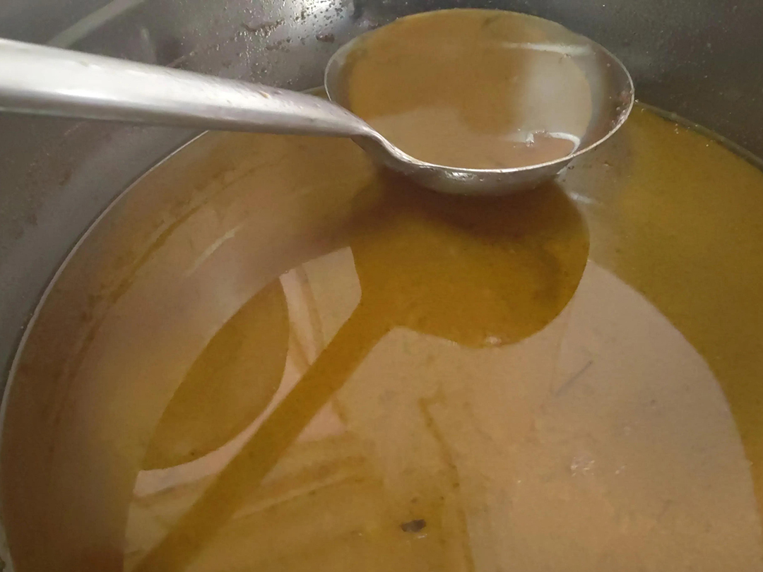 清理完料渣,再将卤水烧开,烧开的时候同时清理掉浮沫。烧开后的卤水静置不动,放置通风处,卤桶下面可以垫点东西,让其与地面保持一定距离,有利于散热。夏天温度高,早、晚各烧开一次,其他季节每天烧开一次。